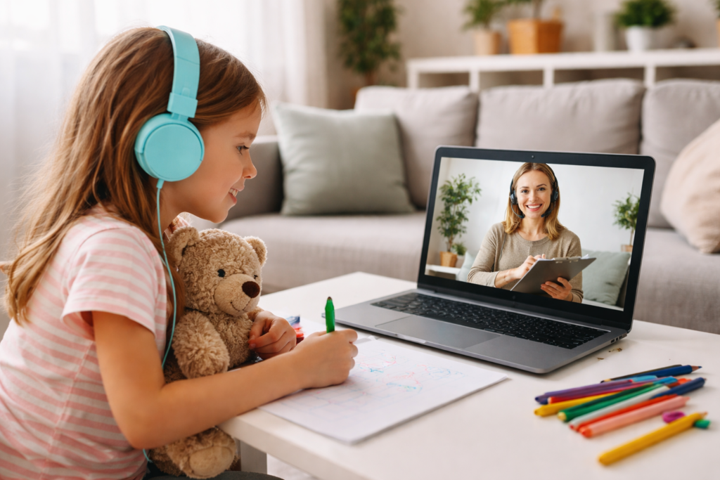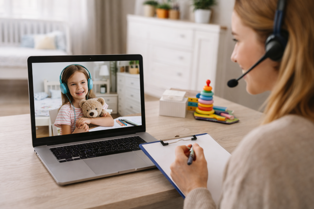 Essa modalidade traz benefícios como praticidade, economia de tempo e maior conforto, já que a criança pode estar em um ambiente familiar durante a sessão.
